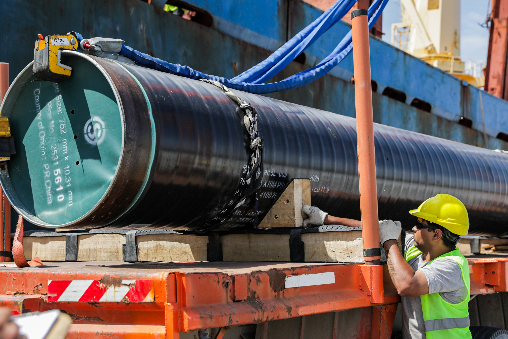 Estos caños forman parte del primer embarque crítico de tuberías para la construcción del gasoducto asociado al proyecto Argentina FLNG, impulsado por el consorcio Southern Energy y destinado a abastecer las futuras plantas flotantes de licuefacción frente a la costa rionegrina.