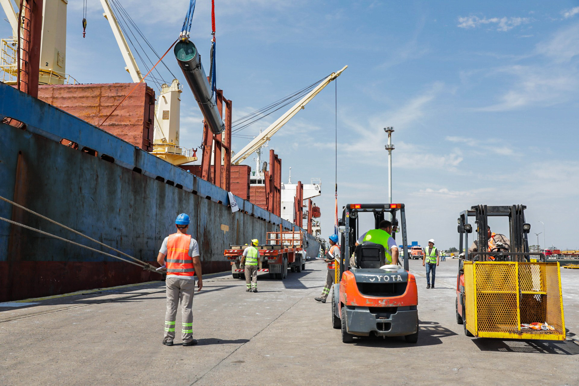 De acuerdo al cronograma operativo, el proceso de descarga de las 10.000 toneladas de caños se desarrollará de manera continua desde este miércoles y, como mínimo, hasta el próximo sábado, bajo un plan especial de descarga, acopio y transporte terrestre.